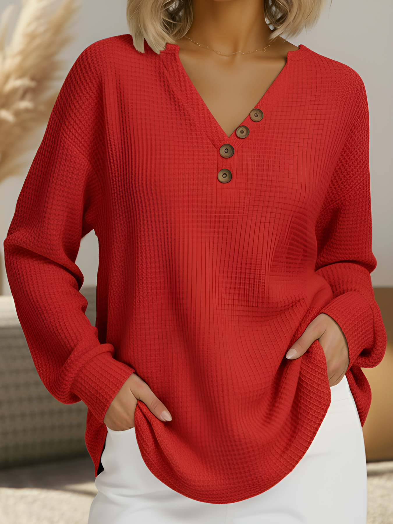 Restez délicieusement au chaud quand il fait env. 5 °C : maille gaufrée double-épaisseur avec intérieur brossé façon polaire pour une douceur enveloppante, respirabilité qui évite toute sensation moite, et coupe détente élégante qui ne colle pas au ventre ni aux hanches. Facile à associer avec jean, jupe midi ou legging — du matin au soir, sans alourdir la silhouette.